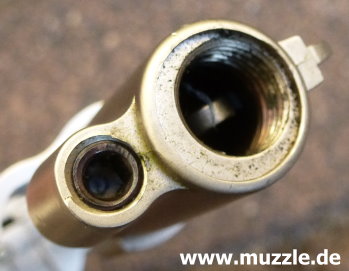 Schlittens nicht einwandfrei funktionieren, da aus den Platz-/Gaspatronen kein Projektil verschossen wird, dass den Lauf zur Mündung hin abdichten würde. Das Foto oben zeigt den Arbeitsschritt, bei dem die