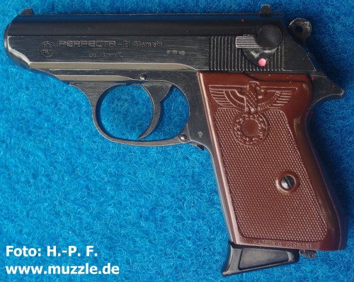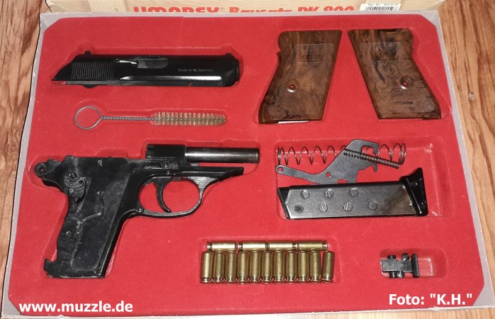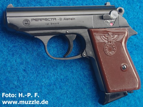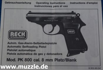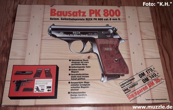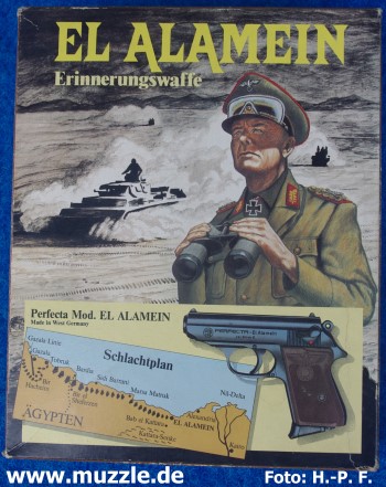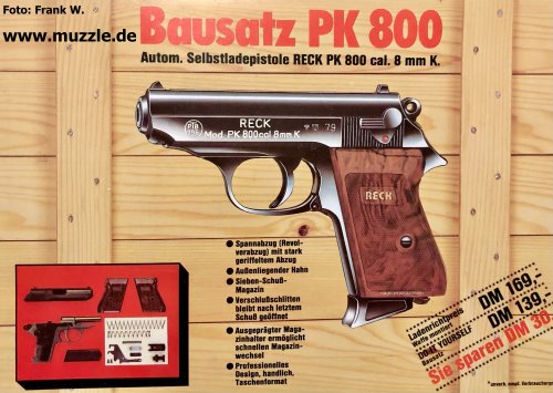 Reck PK 800 / Perfecta “El Alamein” Hersteller: UMAREX (RECK) Modell: “PK 800” Serien-Nummer: 979 PTB 196 Kaliber: 8 mm K Länge: 153 mm Höhe: 118 mm Breite: 27 mm Ausführung: brüniert, braune Kunststoffgriffschalen Preis: 180,- DM Hinweis: Waffe wurde auch als Bausatz im Handel angeboten.