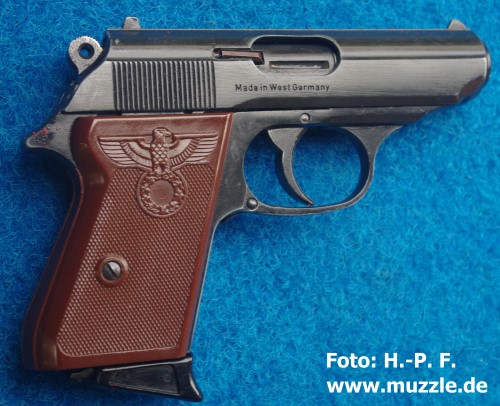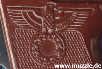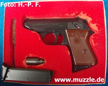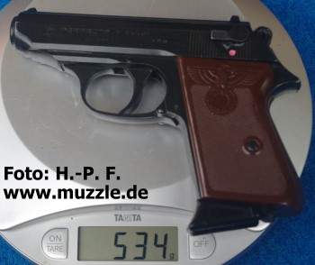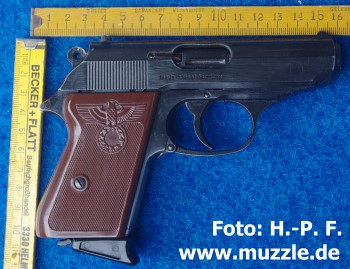 Kaliber: 8 mm K Länge: 153 mm Höhe: 118 mm Breite: 27 mm Gewicht: 534 g Ausführung: brüniert, braune Kunststoffgriffschalen mit Reichsadler und Eichenlaubkranz (ohen Hakenkreuz) Danksagung: Vielen Dank an H.-P. F. für die Überlassung und Freigabe der Fotos.