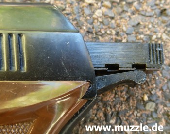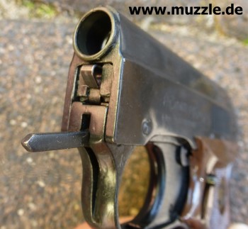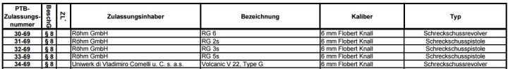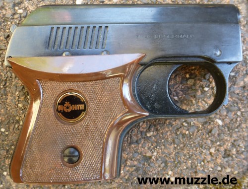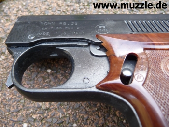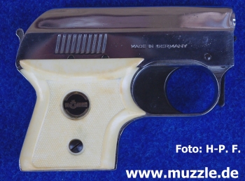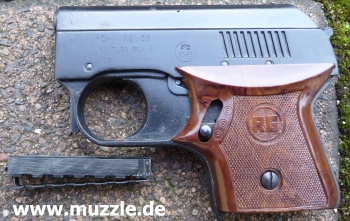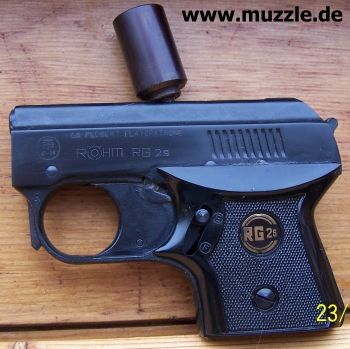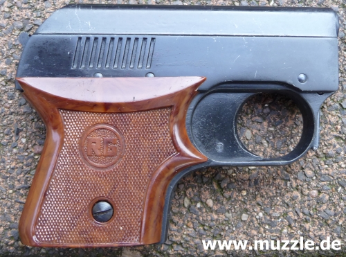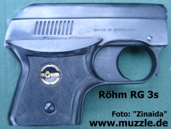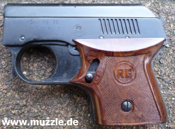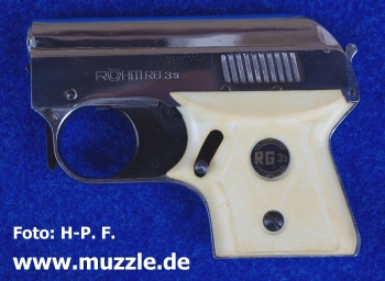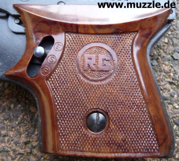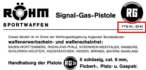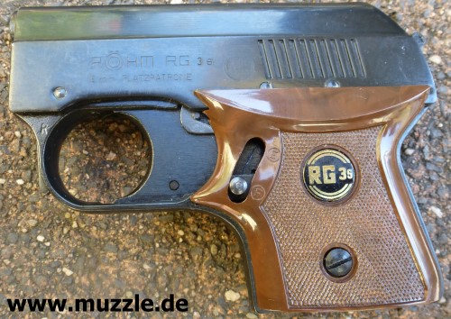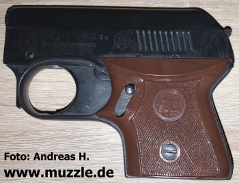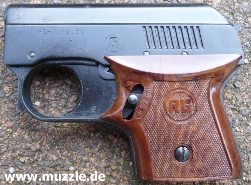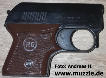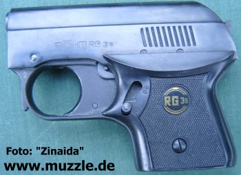 Kaliber: 6 mm Flob. Pl. Magazinkapazität: 6 Schuss Abzug: Double Action Sicherung: Schwenkhebel links, blockiert die Abzugsmechanik Länge: 104 mm Höhe: 72 mm Breite: 23 mm Gewicht: 295 Ausführung: Gehäuse Zinkdruckguss brüniert, braune Kunststoffgriffschalen Beurteilung: Sehr gut verarbeitete und zuverlässige Signalwaffen im Format einer Taschenpistole. Nachfolgemodell: “RG3” (ab 1974)