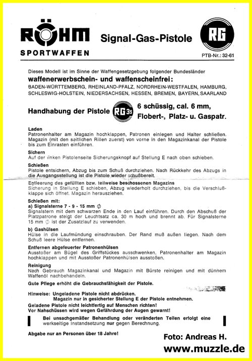 Fotos unten: “muzzle.de”-Leser Andreas H. zeigt Fotos seiner “Röhm RG3s” (PTB-Nr. 32-69) nebst einer Bedienungsanleitung mit der falschen PTB-Nr. 32-61 (anstatt 32-69). Vielen Dank.