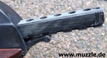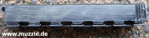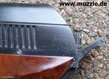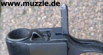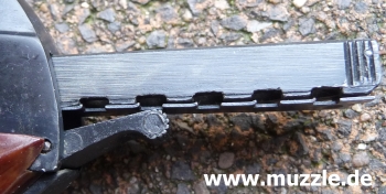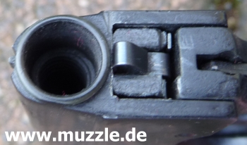 Foto oben links: Der Sicherungshebel der “RG3s” hat drei optionale Stellungen. “E” für entladen, “S” für sichern und “F” für feuern. In Position “E” kann mittels mehrmaliger Abzugsbetätigung das Magazin nach hinten aus dem Schacht heraus bewegt werden, ohne das eine Kartusche gezündet wird. Fotos oben rechts und unten: Unter der Mündung befindet sich ein ausklappbarer Dorn. Er dient als Werkzeug, um die leeren Patronenhülsen auf dem Magazin zu drücken.