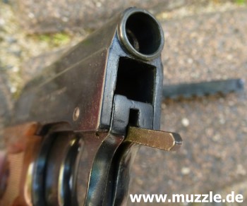 Foto unten: Die “RG2s”-Startpistole (PTB 31-69) mit Ausschuss nach oben und Pyrobecher.