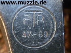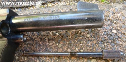 dere Teil ist für die direkte Aufnahme von 9-mm-Pyromunition ausgelegt. Dahinter folgt eine Verengung mit Gewinde für den aufschraubbaren Pyrobecher. Ganz im Hintergrund ist die Laufsperre zu sehen, die von oben
