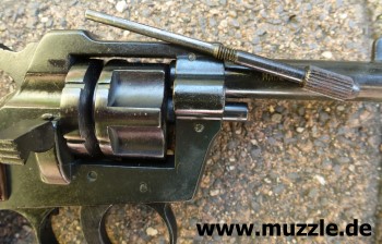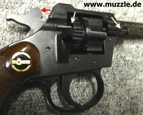 drehen. Dann öffnet man die Ladeluke, führt den Ausstoßer von vorne durch den Tunnel am Rahmen (weiße Pfeile) und befödert so die leeren Hülsen, eine nach der anderen, aus den Trommelkammern. Die Trommel wird
