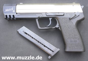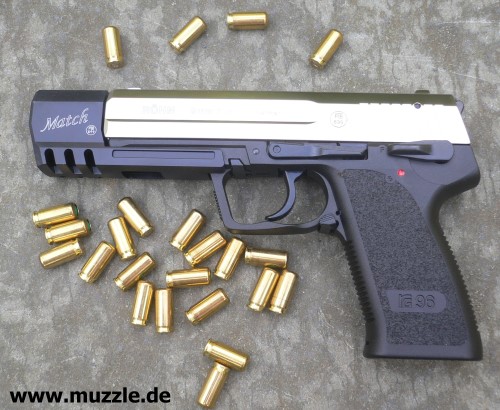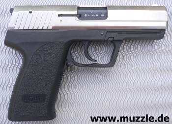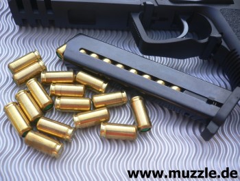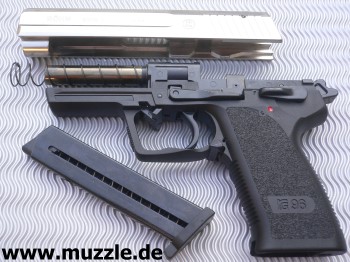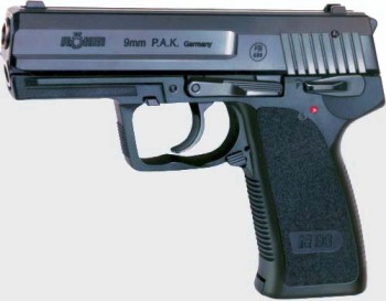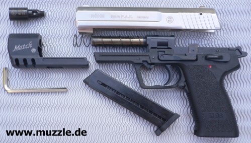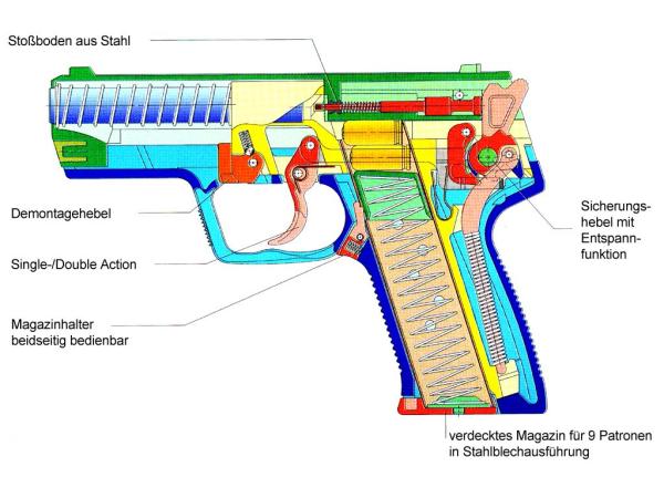 Kaliber: 9 mm P.A.K. Magazinkapazität: 9 Schuss Abzug: Single Action / Double Action - Semiautomatik Sicherung: Schwenkhebel links, unterbricht die Abzugsmechanik - in Position “gesichert” kann der Hahn nicht manuell vorgespannt werden, bzw. bereits vorgespannter Hahn wird wieder entspannt (Sicherheitsrast) Länge: 225 mm (187 mm ohne Kompensator) Höhe: 140 mm Breite: 35 mm Gewicht: 945 g (ca. 850 g ohne Kompensator)