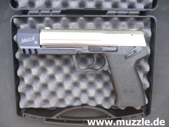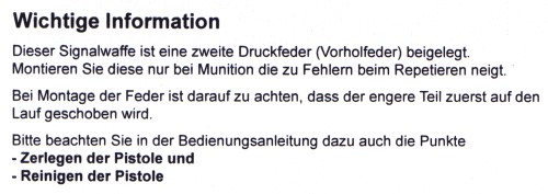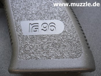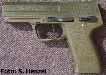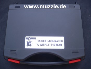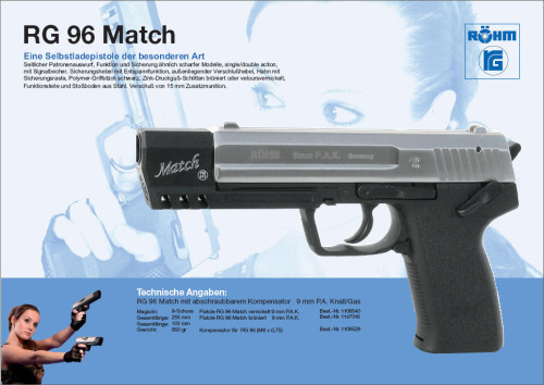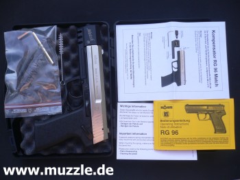 Ausführung: Kunststoffgriffstück schwarz; Schlitten Zinkdruckguss verloursvernickelt; Kompensator Zinkdruckguss brüniert; Lauf, Stoßboden und Funktionsteile aus Stahl Lieferumfang: Waffe im Kunststoffkoffer mit Laufgewicht in “Kompensator”-Optik und Siganalbecher, Manual, zweite Druckfeder, Inbusschlüssel, Reinigungsbürste Beurteilung: Sehr gut verarbeitete Pistole mit bekanntem Vorbild, die auch funktionell überzeugt und unter Anwendern als eine der zuverlässigsten Signalwaffen gilt. Bemerkungen: Im Fachhandel ist ein Apportiergerät für das Hundetraining auf Basis der “RG 96” erhältlich, siehe -> Rapid Launcher Preise 2008 (Internetfachhandel): RG96 Match - veloursvernickelt ca. 140,- EUR RG 96 - veloursvernickelt ohne Komp. ca. 115,- EUR RG96 brüniert - ohne Komp ca. 100,- EUR Kompensator einzeln: ca. 26 ,- EUR (Nachrüstsatz für Waffe mit “M8 x 0,75” - Laufgewinde)