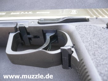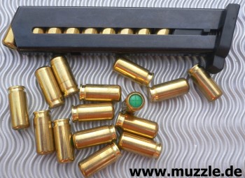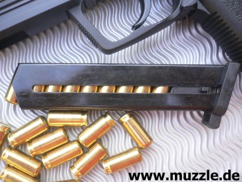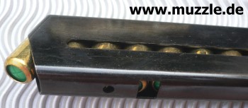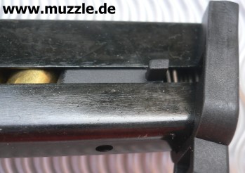 Das Bestücken des Magazins mit maximal 9 Patronen im Kaliber 9 mm P.A.K geht dank des Federschiebers (Bild unten links) leicht von der Hand. Der vorstehende Zapfen wird mit dem Daumennagel gegen den Widerstand der Magazinfeder nach unten gedrückt. Die Patronen müssen dann nur noch vorsichtig unter die Lippen der Magazinaufnahme geschoben werden.