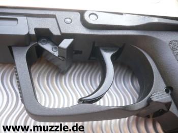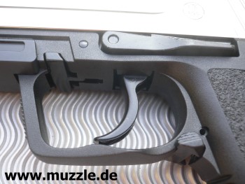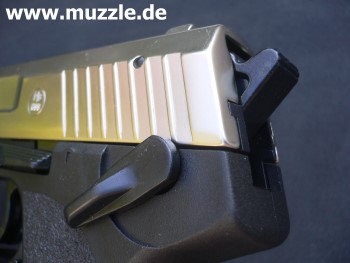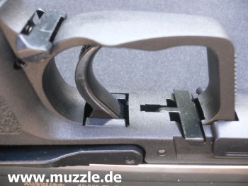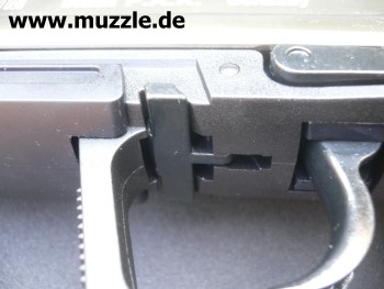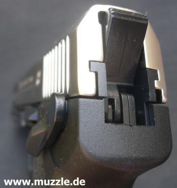 Bilder unten: Blick auf den Hahn in entspannter (links) und vorgespannter Position (rechts). Vorgespannt verkürzt sich der Vorzugsweg erheblich und der Abzugswiderstand ist deutlich verringert. Das Spannen erfolgt entweder durch das Zurückziehen des Schlittens, oder einfach mittels Fingerkraft.