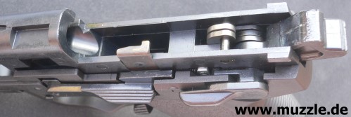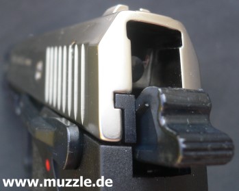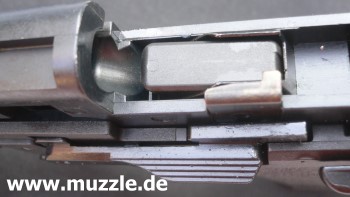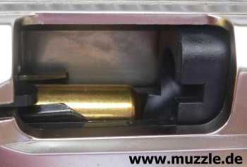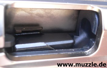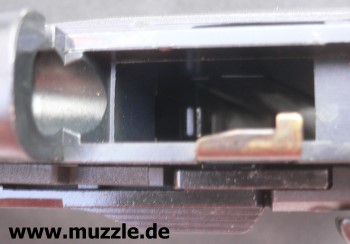 Bilder oben: Blick in das Auswurffenster im Schlitten, jeweils bei eingeschobenem Magazin. Links mit bestücktem, rechts mit leerem Magazin.
