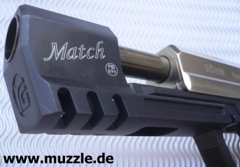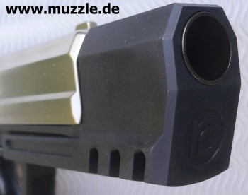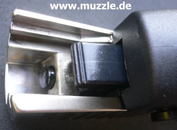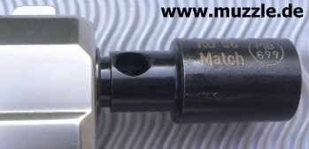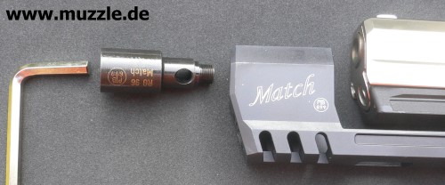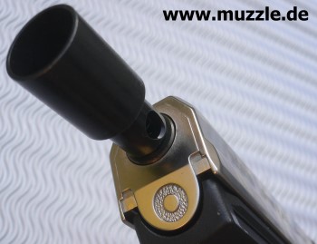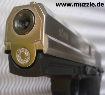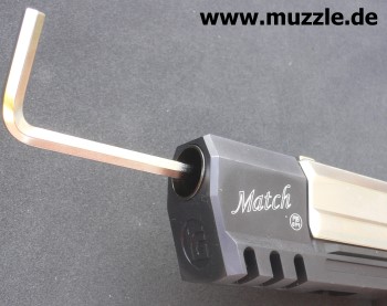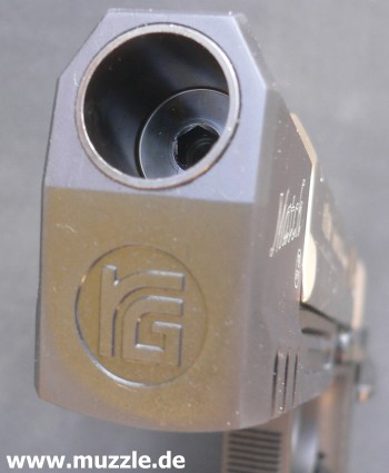 Der Kompensator Bilder unten: Die imposante “Kompensator”-Mündungsansicht der “RG 96 Match”. - Man erkennt bei näherem Hinsehen natürlich gleich, dass es sich hier nicht um eine “scharfe” Feuerwaffe handeln kann, da man in den Aufsatzbecher mit Innensechskant blickt. Zur Selbstverteidignung mit Pfeffer- oder Gasmunition eignet sich die “Match” nicht, denn der Signalbecher und seine Entlastungsbohrungen behindern die Generierung einer adäquaten Wirkstoffwolke bei Schussabgabe. Wer die Pistole zur Selbstverteidigung (mit dem “Kleinen Waffenschein”) führen möchte, der sollte sie auf die ohnehin handlichere “Normalausführung” ohne Kompensator zurückbauen.