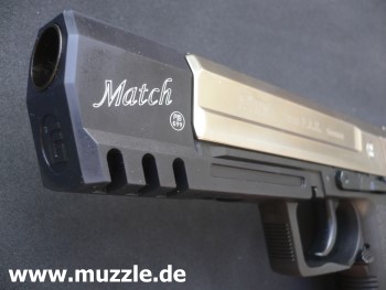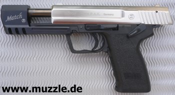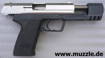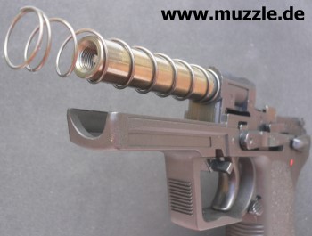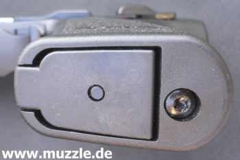 Genial einfach, einfach Genial: Die De-/Montage des “Kompensators” (Bilder oben). Bilder unten: Die “nackte” Pistole, ohne den Kompensator, welcher übringens ausschließlich in brünierter Ausführung angeboten wird.