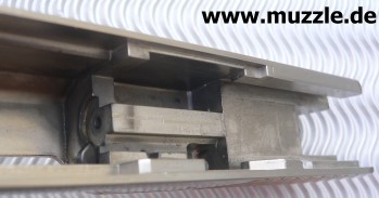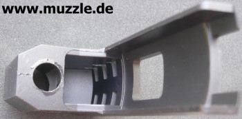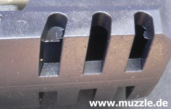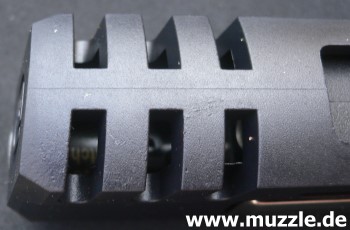 Bilder unten: Die Unterseite des brünierten Druckguss-”Kompensators”. Auf dem rechten Foto erkennt man in den Aussparungen (Ventilierschlitzen) hauchdünne Grate. Hier war etwas Nachbearbeiten erforderlich, um ästhetischen Gesichtspunkten Genüge zu tun. Die hauchdünnen Materialreste ließen sich leicht entfernen, ohne Bearbeitungsspuren o. ä. zu hinterlassen.