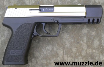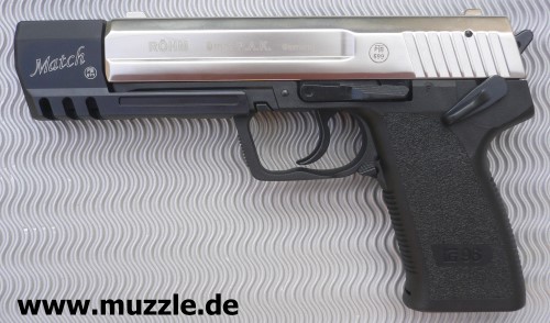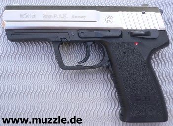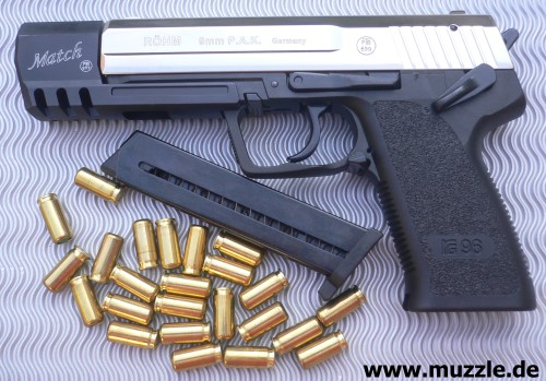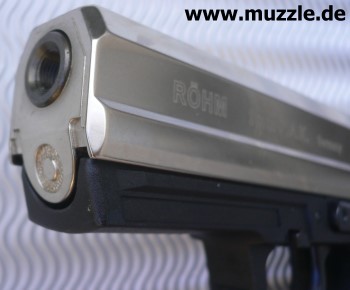 Fazit: Fragt ein Neuling in einschlägigen I-Net-Foren nach einer haltbaren und zuverlässigen Schreckschuss- Pistole, die “Röhm RG 96” ist erfahrungsgemäß häufig unter den empfohlenen Kandidaten zu finden. Nicht ohne Grund ist die Waffe sehr beliebt, denn das seit Jahren im Handel erhältliche Modell ist nicht nur einer bekannten Behördenpistole nachempfunden, sondern hat sich im praktischen Gebrauch auch technisch absolut bewährt. Hinzu kommt, dass die Verarbeitungsqualität duchaus gehobenen Ansprüchen genügt. Neu ist hingegen der mit wenigen Handgriffen montierbare und auch einzeln nachrüstbare Kompensator. Dieser ist zwar Selbstverteidigungseinsätzen - wie oben erwähnt - völlig abträglich, als “Verkleidungsbauteil” für den Signalbecheraufsatz aber ein echter Augenschmeichler und verleiht der Waffe ein wuchtig-sportliches Aussehen, dass auch in der Sammlervitrine einiges her macht.
