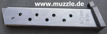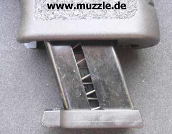 Das Magazin Um es zu entnehmen betätigt man den federbelasteten Entriegelungsmechanismus am Übergang vom Abzugsbügel zum Griffstück. Ein leichter Druck mit dem Daumen genügt und das Metallmagazin wird aus dem Griffboden ausgeworfen. (Bilder unten)