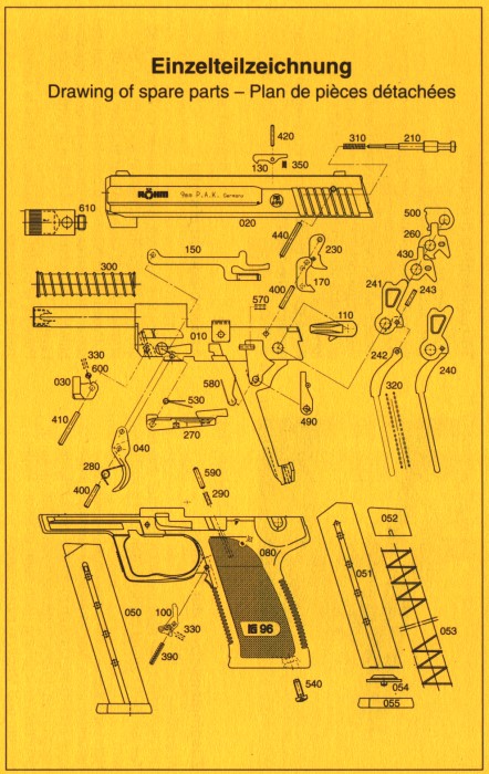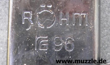 Hinweis auf ein merkwürdiges Detail: Bei dem “Röhm”-Schriftzug auf der hier gezeigten “RG96” handelt es sich weder um die bekannte Aufschrift mit dem berühmten “ö” in stilisierter Bohrfutter-Optik, noch um das “ö” wie es nach der Röhm-Übernahme durch das UMAREX-Konsortium später Verwendung findet.