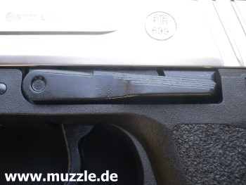 Die Bedienteile der “Röhm RG 96” Bilder unten: Oben am Abzugsbügel, versenkt im Gehäuse, befindet sich der Hebel für die Schlittenentriegelung (Zerlegevorgang). Am Übergang vom Abzugsbügel zum Griffstück sitzt die Magazinentriegelung (Foto links unten). Oberhalb des Abzugszüngels, seitlich am Gehäuse ist der Schlittenfanghebel zu finden (Bild rechts unten).
