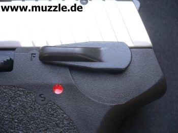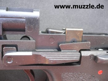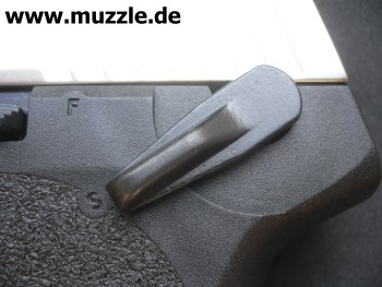 Bilder unten: Der Sicherungshebel. - In Position “S” (Safe) gebracht, ist die Pistole gesichert. Die Sicherung übernimmt verschiedene Unterfunktionen. Zum einen unterbricht sie die Mechanik des Spannabzuges, zum anderen kann der Hahn auch nicht manuell gespannt werden. Ein bereits vorgespannter Hahn wird automatisch wieder entspannt, sobald der Hebel von “F” (Fire) in die “S”-Stellung gebracht wird. Er liegt dann aber nicht auf dem Schlagbolzen auf, sondern befindet sich in der Sicherheitsrast. Die Sicherheitsrastung ist de facto eine Fallsicherung. Es wird beim Vorhandensein einer Patrone im Patronenlager kein Schuss ausgelöst, sollte die Pistole unglücklich mit dem Hahn aufschlagen.