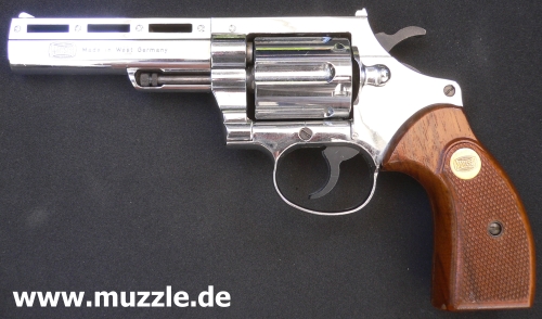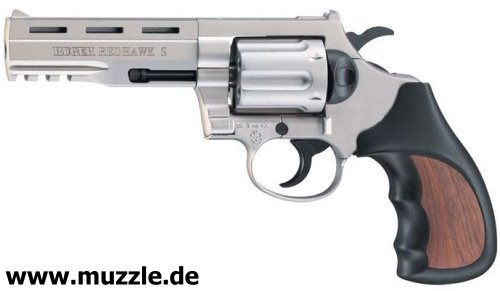 Hinweis: Revolver mit Becher (Foto oben) geeignet für das Abschießen von Pyromunition Ausführungen: Nickelfinish / Schwarz Preis 2007: ca. 180,- EUR Foto unten: “Ruger Redhawk” mit Kunststoffgriff des “Colt Detective Special” (vielen Dank an C. Steinke)