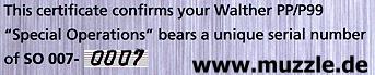 plus “Walther P99”) vorbehalten. Die einzeln zu erwerbenden Sondermodelle der limitierten “Special Operations”-Serie führen die Serien-Kennung “JB” (für James Bond), also z. B.: JB 007-0007, oder JB 007- 0471, etc..