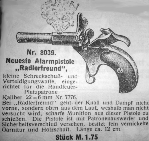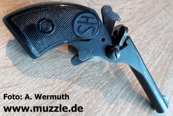 HS Radfahrerpistole (Alarmpistole, Scheintodpistole) Alarmpistole mit Ausschuss nach oben. Hersteller H. Schmidt (“HS”)