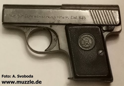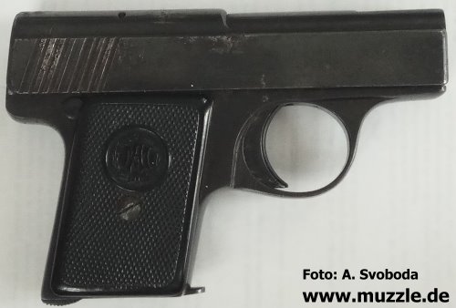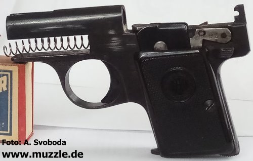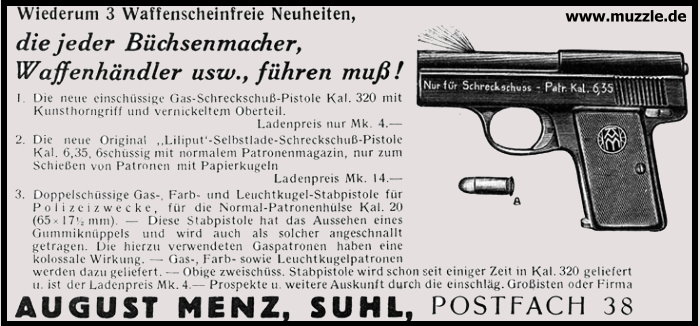 Hersteller: “Waffenfabrik August Menz”, Suhl, Deutschland (ab 1937 “Lignose AG”, Berlin, Deutschland) Kategorie: Halbautomatische Taschenpistole Herstellzeitraum: ca. 1926 - 30er Jahre Kaliber: 6,35 mm (Gas-/Schreckschuss) Magazinkapazität: 6 Patronen (Stangenmagazin) Sicherung: Schwenkhebel linksseitig Visierung: Offene Visierung (Kimme und Korn) Länge: ca. 104 mm Gewicht: ca. 280 g Technik: Rückstoßlader mit Masseverschluss (“Single Action”) Ausführung: Stahl (brüniert), Kunststoffgriffschalen mit “AM”-Logo (August Menz) Beschriftung: Nur für Schreckschuss-Patr. Cal. 6,35 Hinweis: Keine “PTB”-Kennzeichnung, da vor 1969 in den Handel gebracht. Danksagung: Vielen Dank an A. Svoboda für die freundliche Übermittlung und Freigabe seiner Fotos exklusiv für “muzzle.de”!