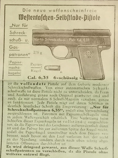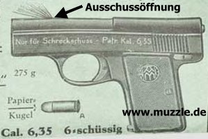 Die halbautomatische, deutsche “Liliput”-Pistole ist den meisten Waffenliebhabern ein Begriff. Sie zählt zu den kleinsten, kommerziell hergestellten, Taschenpistolen. Was jedoch vielen nicht bekannt ist: Sie wurde auch modifiziert als Schreckschusspistole für Papierkugeln im Kaliber 6,35 mm in den Handel gebracht. In dieser Version besitzt die Pistole eine Ausschussöffnung nach oben und der Lauf ist vor der Mündung stark verjüngt. Im Foto unten rechts zeigt das Exemplar mit aufgefrästem Laufmantel diesen Sachverhalt.