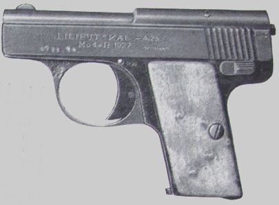 “Liliput”-Pistole Die “Liliput” ist eine der kleinsten, halbautomatischen Taschenpistolen. Sie erschien 1920 beim Hersteller “Waffenfabrik August Menz” in Suhl (Deutschland) und wurde zunächst für die damals relativ neue 4,25 mm-Patrone (<-1918, Franz Pfannl) entwickelt. Ausgetattet ist sie mit einem einreihigen Stangenmagazin mit einem Fassungsvermögen von 6 Patronen. Es handelt sich technisch um einen Rückstoßlader mit Masseverschluss (“Single Action”). Anno 1926 wurde eine geringfügig vergrößerte Version der “Liliput” auf den Markt gebracht, für die Verwendung des viel gebräuchlicheren Kalibers 6,35 mm Browning. Im Jahre 1927 wurde dann die Fertigung der 4,25mm-Version eingestellt. Mutmaßlich endete die Geschichte der “Liliput”-Pistole am Anfang, bzw. im Verlauf des 2. Weltkriegs. Im Jahre 1937 endete die “Menz”-Ära. Die Waffenfabrik in Suhl wurde von der in Berlin ansässigen “Lignose AG” übernommen. Die Waffenproduktion verblieb aber weiter am Standort Suhl. Die Vermarktung der Waffe wurde fortan unter dem Handelsnamen “Theodor Bergmann Erben” durchgeführt. Der Waffenhersteller “Bergmann” wurde von der “Lignose AG” bereits im Jahre 1921 ebenfalls aufgekauft. Weitere Handelsname für diese Pistole: “Bijou”, “Kaba”, “Orzel” (Details dazu weiter unten). Foto unten links: “Liliput” im Kaliber 4,25 mm, Modell 1927, mit Holzgriffschalen ohne Emblem. Die “Liliput” wurde im Laufe ihrer Fertigung verschiedentlich modifiziert. So existieren Exemplare mit zwei unterschiedlichen Zerlegemechanismen hinten am Verschluss und differierenden Emblemen auf den Griffschalen, sowie eine Version mit Nickelfinish. Außerdem gab es folgende Beschriftungen linksseitig am Schlitten: LILIPUT-KAL. 6,35 - LILIPUT KAL. 6,35 - “LILIPUT” KAL. 6,35 Modell 1925 - “LILIPUT” KAL. 6,35 Modell 1926 - “LILIPUT” KAL. 6,35 Modell 1927 - “LILIPUT” KAL. 6,35 Modell I - Exemplare mit komplett anderen Bezeichnungen erschienen ebenfalls im Handel: Bijou B I Liege-Belgique (Belgien), “Orzel” Kal. 6,35 (Osteuropa) und unter dem Handelsnamen der Firma “Karl Bauer” (Berlin): “KABA” KAl. 6,35 SPEZIAL Auch die “Liliput” Kal. 4,25 mm gab es mit Zusatzbeschriftungen: Modell 1925 - Modell 1926 - Modell 1927 und Modell I. Angeboten wurden Versionen mit Nickel- und Goldbeschichtung. In der Deluxe-Ausgabe Gold mit gravierten Pflanzenornamenten hatte die Pistole weiße Griffschalen. Die “Liliput” im Kaliber 7,65 mm existiert mit nachfolgenden Beschriftungen: “Liliput” Kal. 7,65 Modell 1925 - Modell 1926 - Modell 1927 - Modell I - “Menz” Model I - “Menz” Modell II Bild unten: “Menz” Modell II, Kaliber 7,65