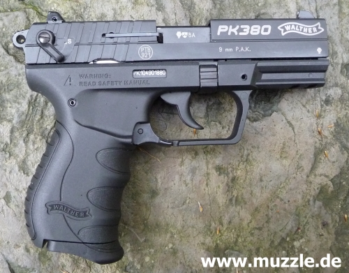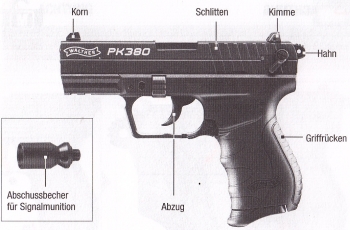 Vorbild: Walther PK380 (P29) - 9 mm kurz/.380 Auto, Preis 348,- EUR (UVP) Markteinführung der SSW: Dezember 2010 Serien-Nr.: PK104901880 und PK105002227 System: Selbstlader, Reizstoff-/Signalpistole Kaliber: 9 mm P.A.K. (Munition mit NC-Pulver empfohlen) Magazinkapazität: 8 Patronen