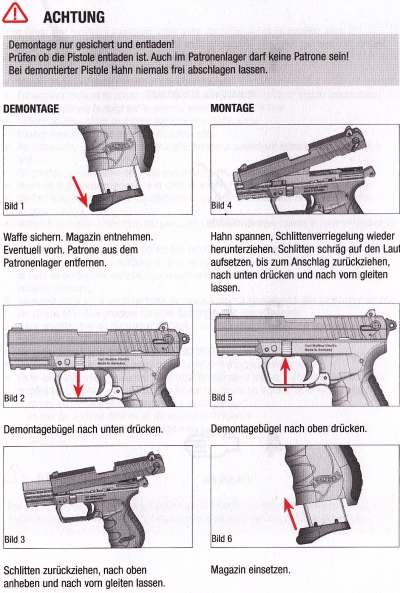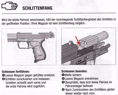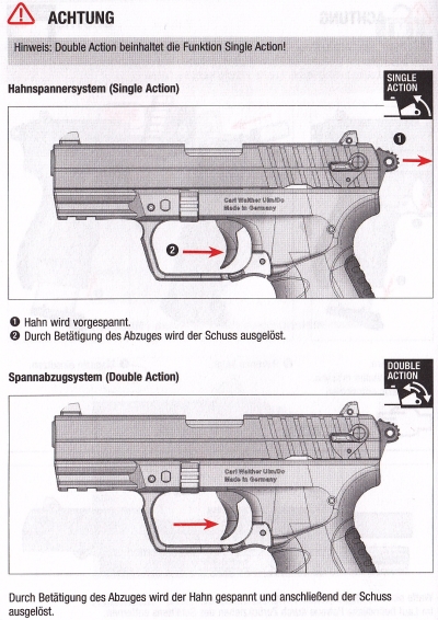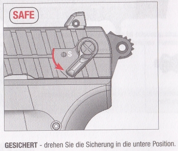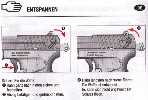 Der vorgespannte Hahn kann natürlich ohne Schussauslösung manuell wieder entspannt werden. Dies sollte aber stets bei gesicherter Waffe (Position “S”) geschehen, um eine ungewollte Schussabgabe zu vermeiden.