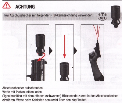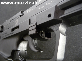 Ausführung: Polymergriffstück mit “Picatinny”-Schiene, Stahlschlitten schwarz (brüniert) mit Lasergravur, Stahlblechmagazin. Hahn, Magazinhalter, Visierung und weitere Funktionsteile ebenfalls aus Stahl gefertigt. Federführungsstange besteht aus Zinkdruckguss. Lieferumfang: Waffe, Signalbecher, Reinigungsbürste, Magnet, mehrsprachige Bedienungsanleitung im Kunststoffkoffer. Bewertung: Kompakte, führige Signalwaffe in hochwertiger Ausführung. Sehr nahe am Vorbild, mit vielen Originalteilen der “scharfen” Feuerwaffe. Vorbildgetreue Markings. Gutes Preis-Leistungs-Verhältnis. Hinweise: Wegen beidseitiger Bedienelemente auch für Linkshänder ohne Einschränkungen geeignet. Die Waffe sollte nach jedem Schießen gründlich gereinigt werden. Funktionstest: Beide Testwaffen im Schießbetrieb (je 48 Schuss) ohne jede Funktionsstörung. Preis 2010: 249,90 EUR (UVP des Herstellers) Rechtliches: Besitz der Waffe frei ab dem vollendeten 18. Lebensjahr. Öffentliches Führen nur erlaubt mit dem “Kleinen Waffenschein”, zwingend in Verbindung mit einem gültigen Personaldokument (Ausweispapiere).