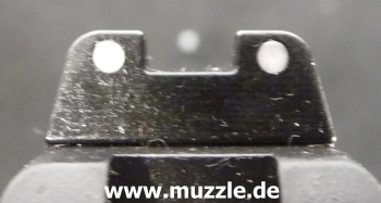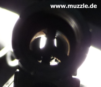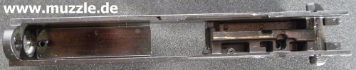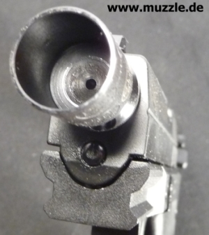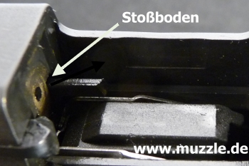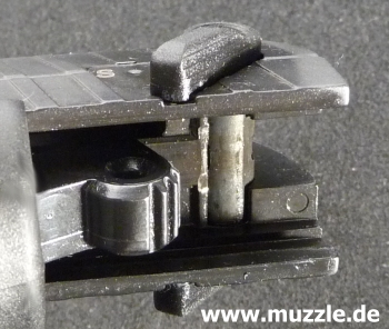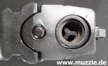 Foto unten: Blick auf den Stoßboden im Patronenlager. Dort trifft der vom Hahn angestoßene Bolzen auf das Zündhütchen am Patronenboden. Die oben gezeigte Sicherung verhindert diesen Vorgang.