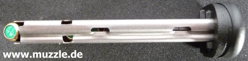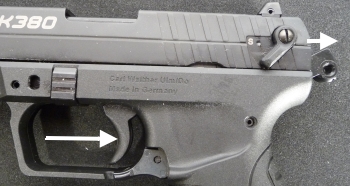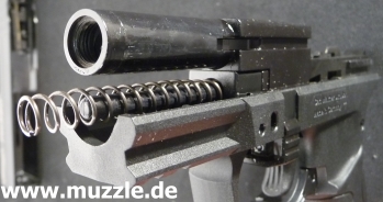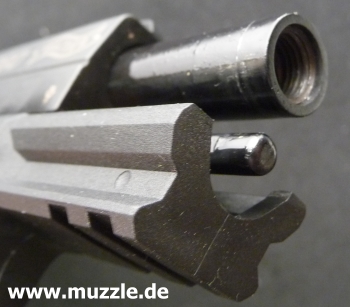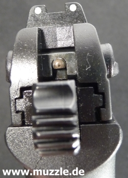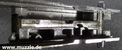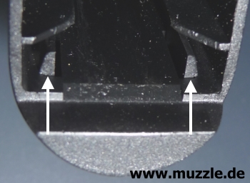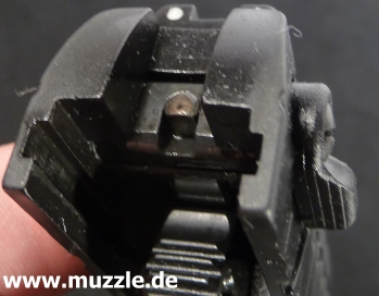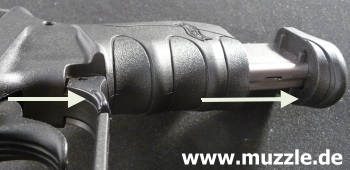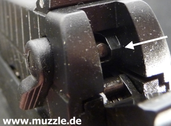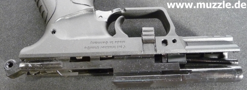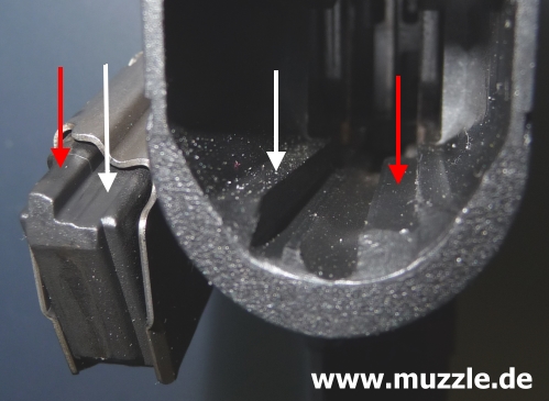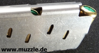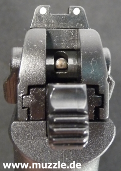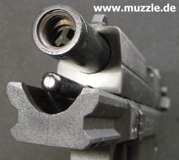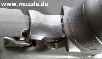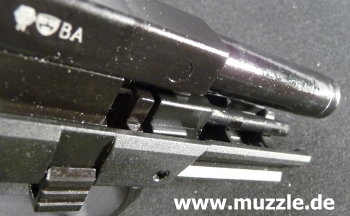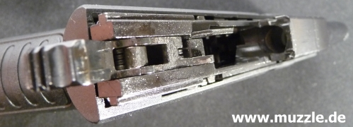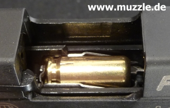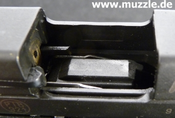 Fotos unten: Blick in das offene Auswurffenster im Schlitten bei eingelegtem Magazin. Das linke Bild zeigt das unbestückte (leere) Magazin, welches den Schlittenfang auslöst (Schlitten in der hinteren Position arretiert). Im Bild rechts das bestückte Magazin durch das Auswurffenster betrachtet.