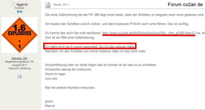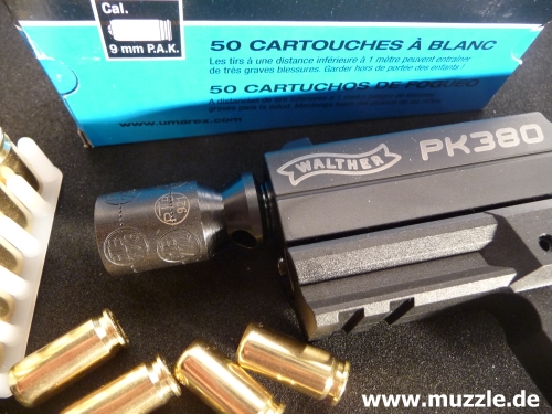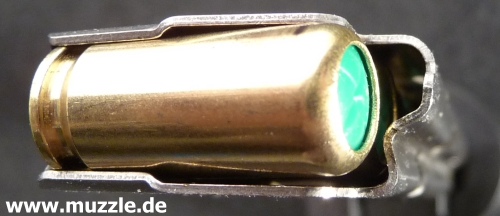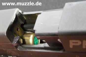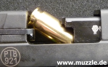 Der oben zu sehende Hülsenklemmer zeigt eine ungezündete Kartusche. Er entstand durch einen zu langsam ausgeführten manuellen Spannvorgang (Durchladen), also durch einen Bedienfehler des Anwenders. Denn bleibt der Verschluss zu lange geöffnet, katapultiert die starke Magazinfeder die Patrone gleich wieder oben aus dem Patronenlager heraus. Wichtig: Der Durchladevorgang muss ruckartig erfolgen. Funktionsbedingte Hülsenklemmer (beim automatischen Auswurf der leeren Kartuschen) gab es bei keiner der beiden Testwaffen. Die vorliegenden “Walther PK380”-Exemplare arbeiteten im Schießbetrieb völlig störungsfrei, präzise und absolut zuverlässig. Beide Pistolen absolvierten jeweils 48 Schuss mit “UMAREX” Knallmunition (NC-Pulver). Hülsenklemmer können z. b. durch ungeeignete Munition (Gasdruck), eine verschmutzte Waffe, oder durch Probleme mit dem Auszieher oder der Schlittenrückholfeder generiert werden. Und sage ich es nicht immer wieder: “Nicht wundern, “muzzle.de” lesen!” ;-)