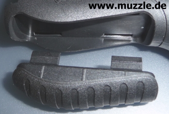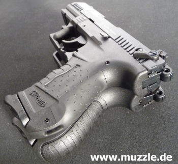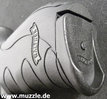 Fotos unten: Der Griffrücken der “PK380” lässt sich durch das Eindrücken der Klammern innerhalb des Griffstückes lösen und abnehmen. Ein Austausch gegen ein anders dimensioniertes Bauteil wäre somit möglich, um den Griffumfang individuell zu verändern.