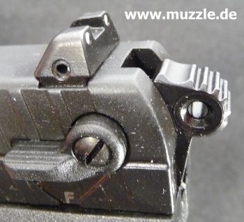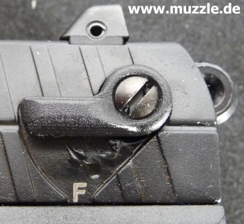 Die Sicherung Mit dem beidseitig am Schlitten bedienbaren Schwenkhebel wird die Walzensicherung in Kraft gesetzt, bzw. die Pistole wieder entsichert. Die Funktion ist denkbar einfach und absolut wirkungsvoll. In Position “S” (für “Safe”) wird die abgeflachte Walze soweit gekippt, dass sie mit ihrer breiteren Stelle nun ein Stück weit über den Schlagbolzen hinausragt, sodass der Hahn nicht auf den beweglichen Stift auftreffen kann. Die Zündung einer im Patronenlager befindlichen Munitionskartusche wird somit zuverlässig verhindert (Bilder unten).