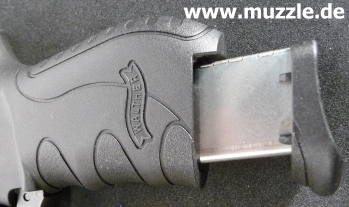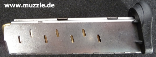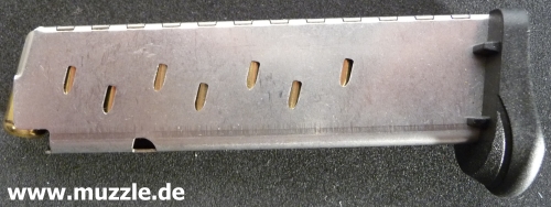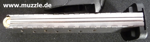 Das Stahlblechmagazin hat eine Kapazität von 8 Patronen im Kaliber 9 mm P.A.K. (Pistole Automatik Knall). Es ist ein eigens für diese PTB-Signalwaffe gefertigtes Bauteil und KEIN nachträglich modifiziertes Magazin von der “scharfen” Feuerwaffe, wie fälschlicher Weise immer mal wieder kolportiert wird. Beim Blick in den Magazinschacht (Foto unten) erkennt man, dass die Aufnahmeschiene exakt für dieses eingefalzte Magazin ausgeführt ist. Das Magazin der “scharfen” Pistole (Kaliber 9mm kurz), dem diese Einfalzung natürlich fehlt, wäre hier definitiv nicht unter zu bringen. Das Magazin gleitet nach dem Entriegeln sehr leichtgängig aus dem Schacht