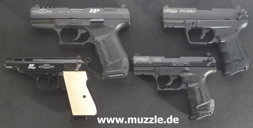 Foto unten: V. l. n. r. “Walther PP”, “Walther P99”, “Walther P22”, “Walther PK380”.