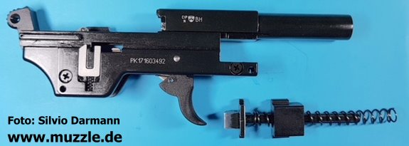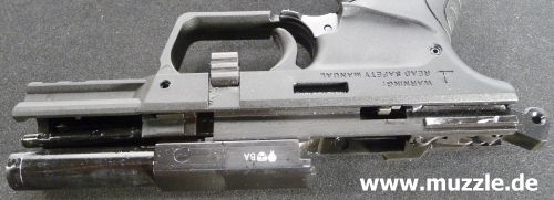 Die Federführungsstange ist (ohne weitere umständliche Totaldemontage) so nicht aus der Waffe entnehmbar (Fotos oben). Das hat zwar den Vorteil, dass diese nicht verloren gehen kann, aber auch ein Nachteil ist unbestreitbar: Beim Reinigen der Waffe ist dies hinderlich und führt zu einer umständlicheren Handhabung. Ich würde hier die weitere Zerlegbarkeit klar priorisieren, wenn ich die Wahl hätte. Fotos unten: Das Griffstück bei demontiertem Schlitten.