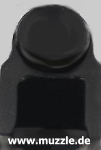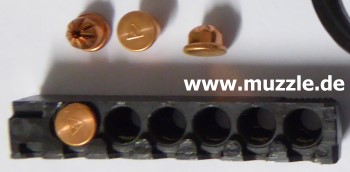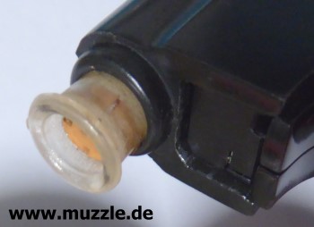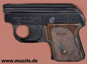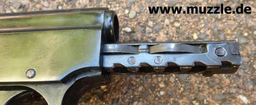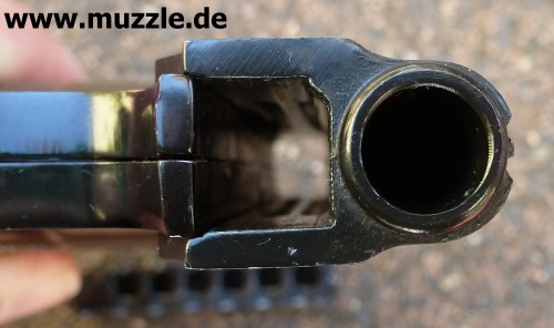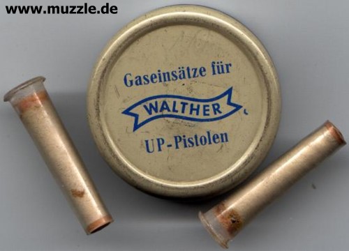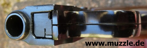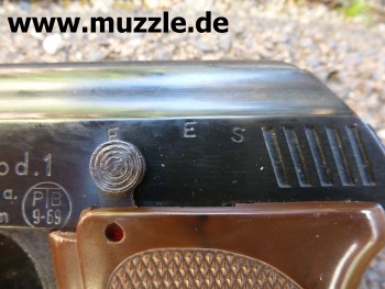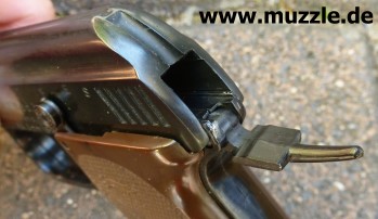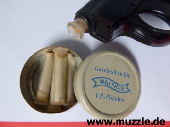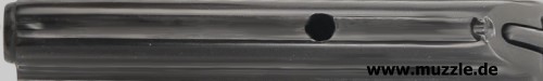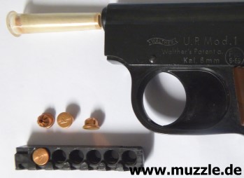Bilder unten: Die “Walther U.P Mod. 2”, PTB 10-69. Bei dieser Version befindet sich die Ausschussöffnung oben am Gehäuse und nicht an der Mündung des Gaskanals wie bei “Modell 1”. Die Mündung des Gaskanals ist hier verschlossen. Die o. g. Zusatzpatronen mit Gas- oder Leuchteinsätzen können nicht verwendet werden.
