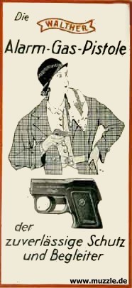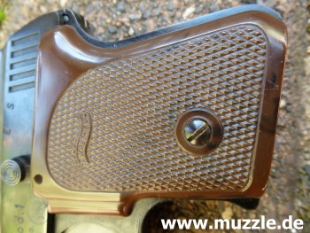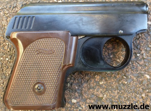 Ausführung: Gehäuse, Griffstück und Magazin aus Druckguss, geschwärzt - braune Kunststoffgriffschalen Lieferumfang: Waffe, Magazin, Bedienungsanleitung (Faltblatt) im Pappkarton. Bewertung: Sehr kompakte und leichte Taschenpistole - heute eher Sammlerstück (je nach Zustand) als Gebrauchsgegenstand. Hinweise: Pistole für Platzpatronen, die auch zum Verschießen von Zusatzpatronen mit Gas- oder Leucht- einsätzen dienen kann (Fotos unten). Die Waffe wurde angeboten in Schwarz mit schwarzen oder braunen Griffschalen, sowie im Chromfinish mit elfenbeinfarbenen Schalen.