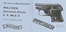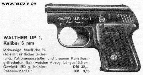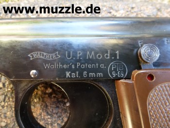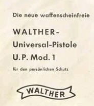 Hersteller: “Walther” Fertigung: Made in Germany Patent: DBP 1013200, 09.01.1958 Modell: U.P. 1 (Universal Pistole 1) PTB-Nr.: 9-69 (frühe Stücke ohne PTB-Kennzeichnung) Markteinführung: Ende 1950er Jahre Serien-Nr.: - keine - Typ: Schreckschuss- / Reizstoffpistole Kaliber: 6 mm