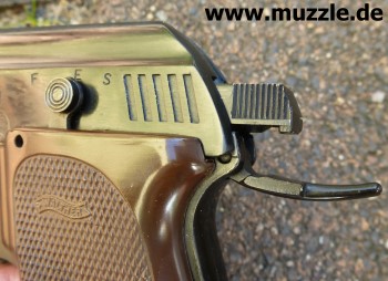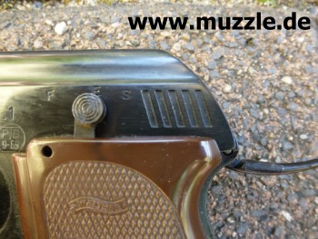 “E” = “ejekt”, in dieser Stellung kann das Abzugszüngel durchgezogen werden. Dadurch wird aber auch bei geladener Waffe kein Schuss ausgelöst, sondern das Magazin bei jedem Durchziehen des Abzugs schrittweise nach hinten transportiert, bis man es am Heck der Waffe entnehmen kann (Foto unten rechts). “S” = “safe”. Die Pistole ist gesichert, das Abzugszüngel blockiert.