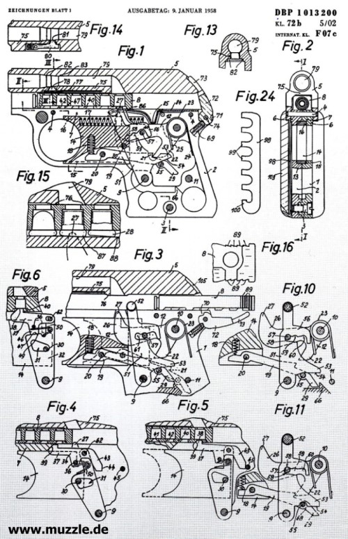 Abbildung unten: Konstruktionszeichnungen aus der Patentschrift der “Universal Pistole” aus dem Jahr 1958.