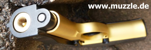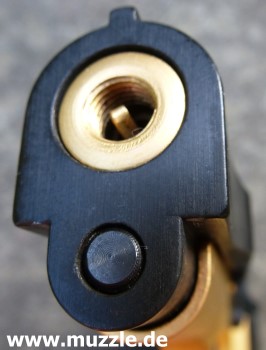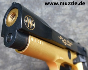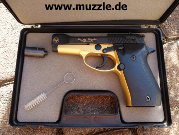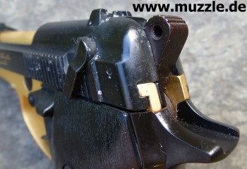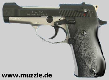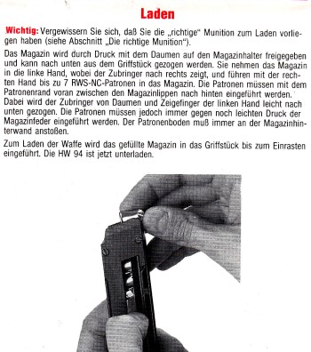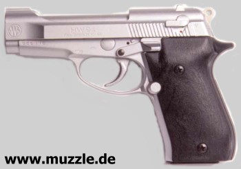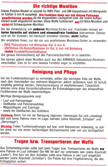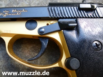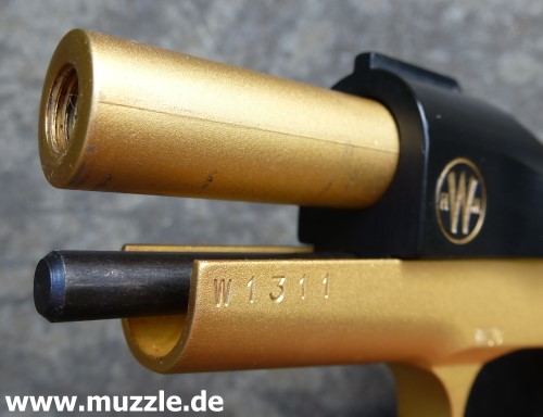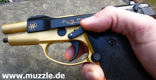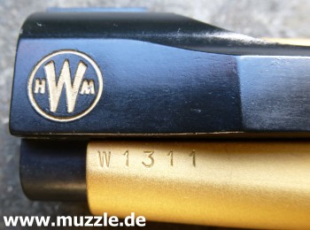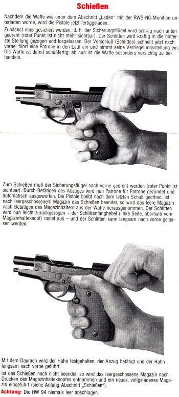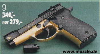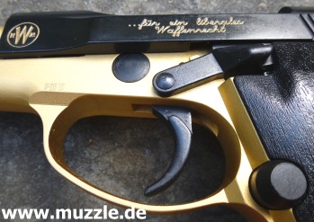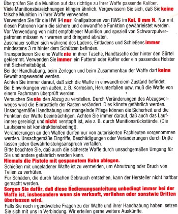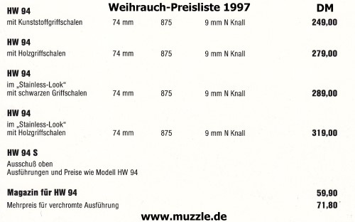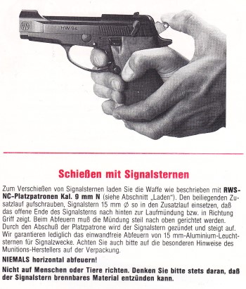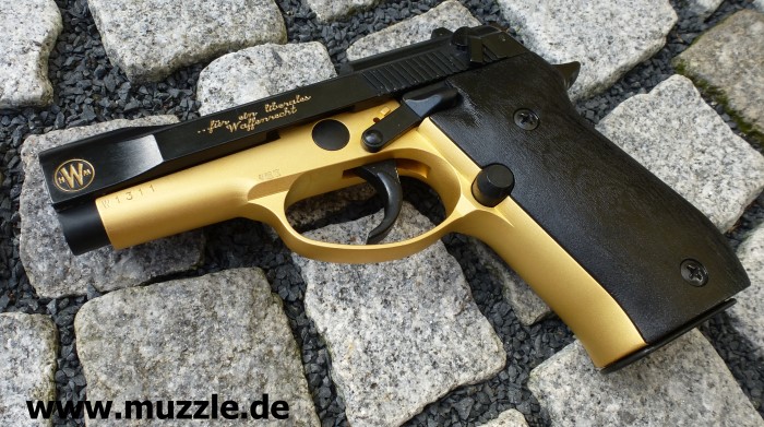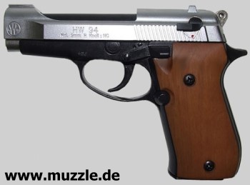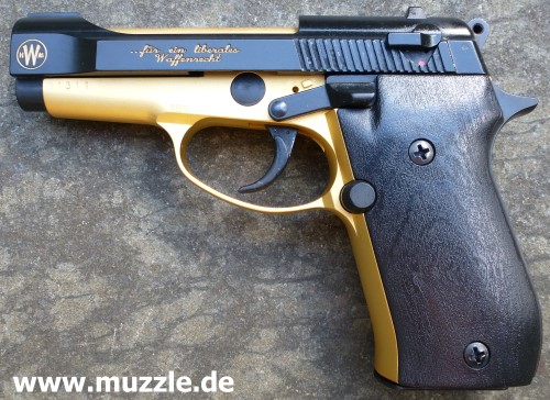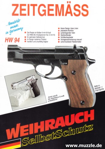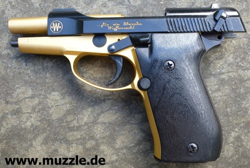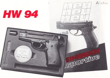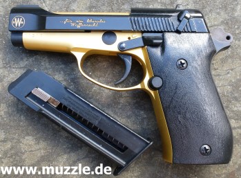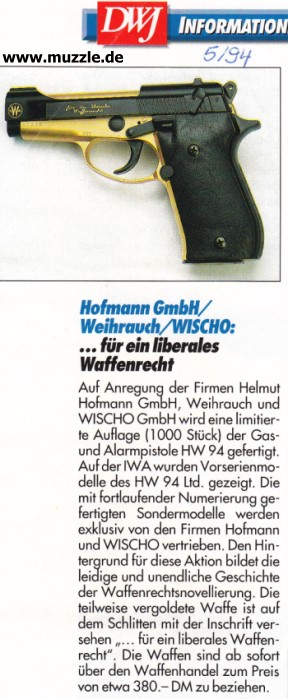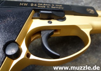 Ausführung: Spritzgussgriffstück galvanisch vergoldet - Schlitten schwarz beschichtet mit vergoldeten Schriftzügen - Kunststoffgriffschalen schwarz in Holzoptik - Zinkgussmagazin - Bedien- und Funktionsteile überwiegend Zinkguss, teilweise Stahl (z. B. Schlagbolzen, Stoßboden). Lieferumfang: Waffe, Signalbecher, Reinigungsbürste, Bedienungsanleitung im Kunststoffkoffer. Bewertung: Hochwertige Optik durch saubere Verarbeitungsqualität und edles Mattgoldfinish. Funktionstest: Lediglich mechanische Funktion geprüft, keine Schusstests mit Munition durchgeführt. Waffe hat leider einen sehr hohen Abzugswiderstand. Bemerkungen: In der “DWJ”-Leserwahl 2. Platz in der Kategorie Gaswaffe des Jahres 1997. - Einzige Signalpistole, welche für Revolvermunition ausgelegt ist. - Waffe auch als Start-Pistole unter der Bezeichnung “HW 94 S” (PTB 509) mit Ausschußöffnung oben gefertigt.