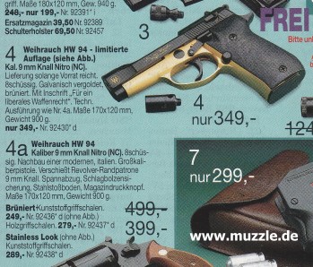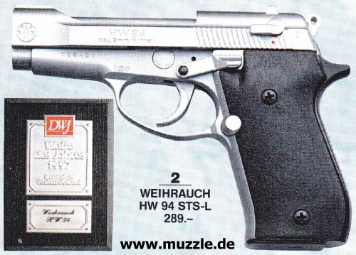Hersteller: Weihrauch Sportwaffenfabrik, 97637 Mellrichstadt, Deutschland Fertigung: Made in Germany Modell: “HW 94” Sonderedition: “... für ein liberales Waffenrecht” - (limitierte Auflage ca. 2.000 Stück, laut Fa. “Weihrauch”) PTB-Nr.: 467 (weitere PTB-Nummern: 634, 695, 855) Beschusszeichen: Nitrobeschuss, Beschussamt Mellrichstadt, “KE” (“K”=9 “E”=4 -> Jahr 1994) Vorbild: Beretta 80er Serie, “Cheetah”