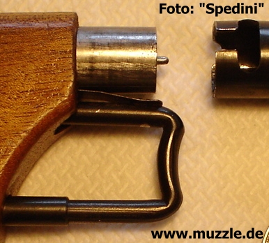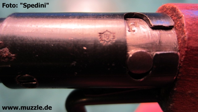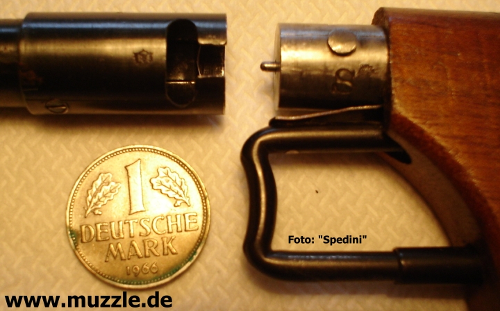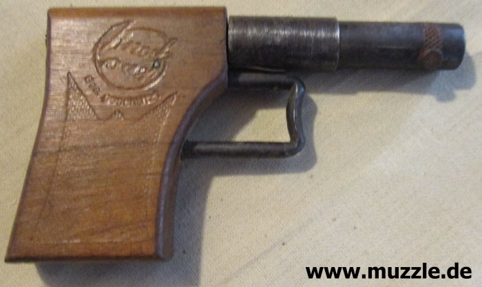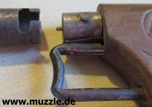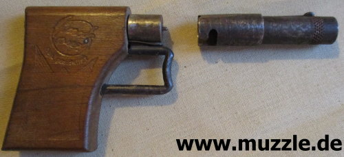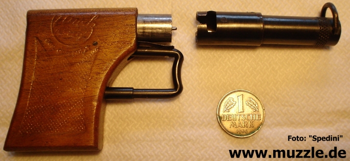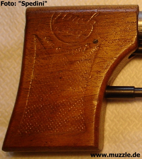 Auf dem Holzgriff befindet sich unterhalb der Modellbezeichnung “Knock Out” der Schriftzug: “Ges. Geschützt”. Wer Informationen zu diesem Meisterwerk deutscher Ingenieurkunst beitragen kann, der möge sich bitte bei mir melden unter eMail: gunimo@muzzle.de Vielen Dank, auch im Namen des Eigentümers “Spedini” (aus Schweden) GUNIMO