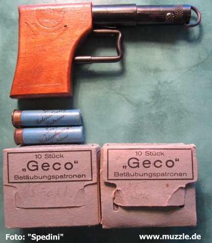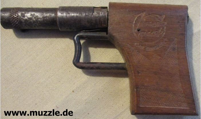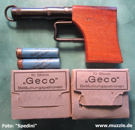 Liebe Leserinnen, liebe Leser, gefragt wird hier nach sachdienlichen Informationen und hilfreichen Hinweisen zur “Knock Out”-Betäubungspistole, die uns “muzzle.de”-Leser “Spedini” auf dieser Seite vorstellt. Der Waffe liegen sogenannte “Betäubungspatronen” der Firma “Geco” im Kaliber 12 mm bei. Die vier überlieferten Pappschachteln zeigen eine handschriftlich ausgeführte Aufschrift “25 je St.” (wohl “25 Pfennig je Stück”). Offensichtlich handelt es sich um eine Selbstverteidigungspistole aus deutscher Fertigung, aus der Zeit vor dem 2. Weltkrieg, mutmaßlich 1920er Jahre. Die Ausführung ist rustikal, etwas primitiv wirkend. Funktional erinnert dieser Vorläufer moderner Gas-/Signalwaffen an das deutsche “Scheintodpistolen”-Modell “BUA No. 99” (Fotos unten), welches ebenfalls aus jener Zeit stammt, jedoch insgesamt deutlich hochwertiger ausgeführt ist. Im Februar 2016 erreichte mich eine Leserzuschrift aus den USA. Der Schreiber, der hier ungenannt bleiben möchte, lieferte mir Fotos und Infos zu seinem Exemplar, welches nach dem 2. WK als Kriegssouvenir aus Deutschland in die USA überführt wurde. --> Klick mich