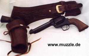 Das Foto (rechts) mit dem Westernholster zeigt zum Vergleich den ME-Revolver (LEP) vor dem Holster. Die Deko-Waffe steckt im Holster.