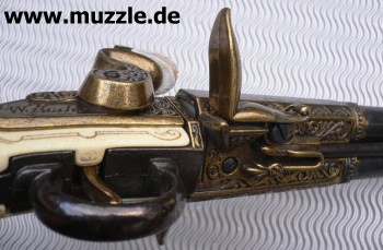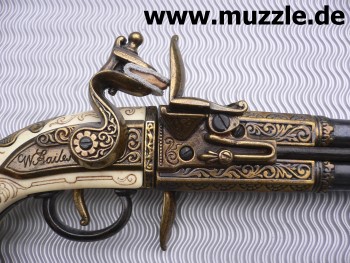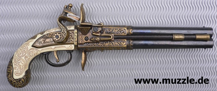 Doppelläufige Steinschlosspistole mit drehbarem Laufbündel, nicht schussfähig.
